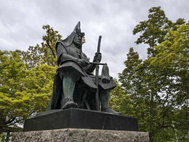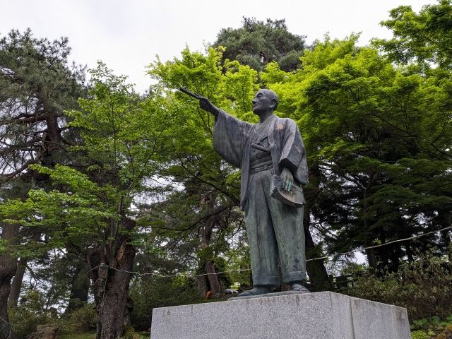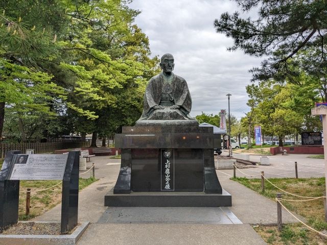 少し歩くと、正座した人物の銅像が見えてきます。こちらは米沢藩9代藩主・上杉鷹山像。崩壊寸前の藩を復興させた江戸時代屈指の名君として知られる人物です。城内にあるミュージアム「伝国の杜(米沢市上杉博物館)」では、そんな鷹山の功績を映像で見ることできます。
