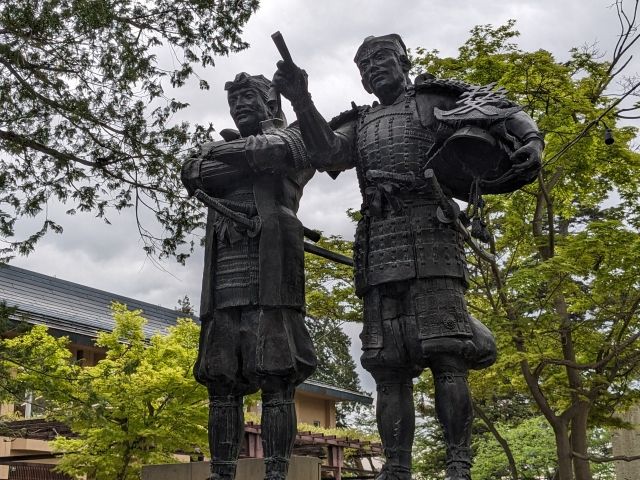 天地人 上杉景勝公と直江兼続公主従像は、米沢のまちを作り上げていく上杉景勝と直江兼続の姿。心なしか笑っているような表情に見える2人の姿を見ていると、胸がアツくなってきます。
