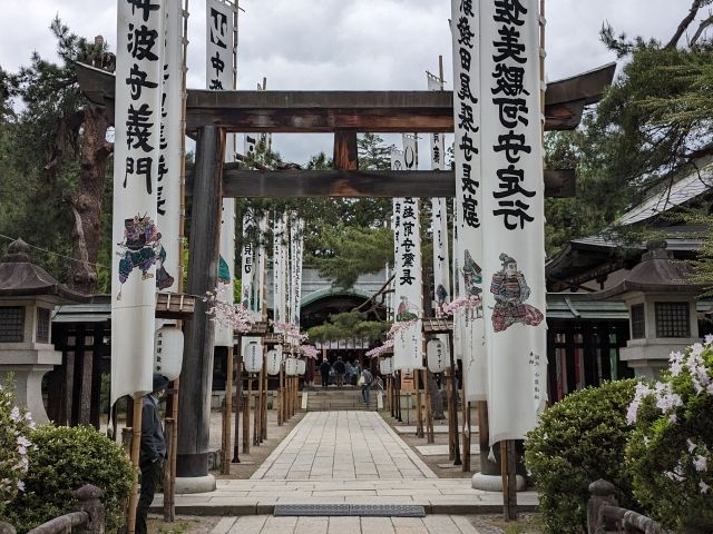 本丸跡に鎮座するのが上杉神社。鳥居と白い幟がシックで高貴な印象を感じさせます。