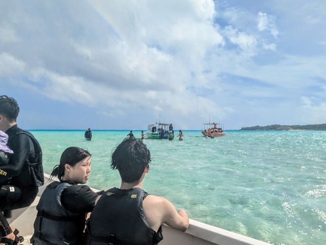 そんな寄り道も挟みつつ進んでいく船。ビーチから10分ほどで、多数の船が集まるポイントが見えてきます。ここが百合ヶ浜ポイントです。
