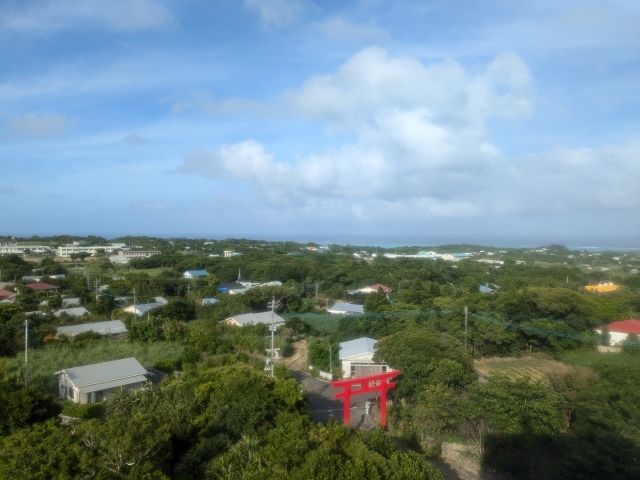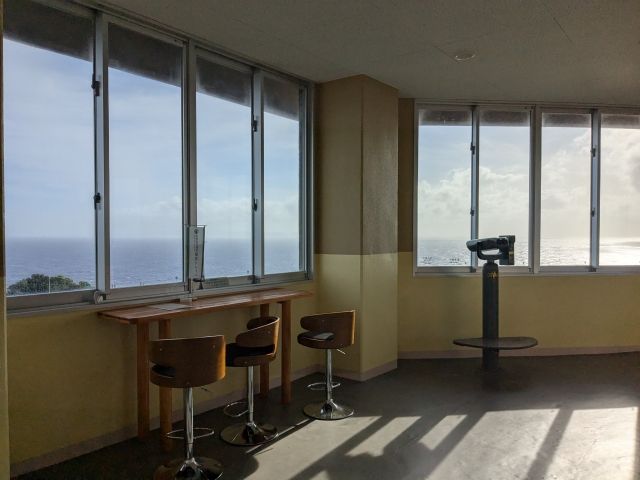 5階は展望室になっており、島内を一望できます。遮るもののない360°のパノラマが広がり、どこを見ても青い空と青い海が広がる景色は最高です!