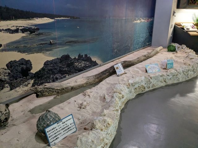 大潮の干潮時に出現する百合ヶ浜の雰囲気を再現したコーナー。白い砂浜には貝殻やサンゴがたくさん。置かれている流木は、人気アイドルグループ嵐が「IN THE SUMMER」のMV撮影時に座っていたそうです。