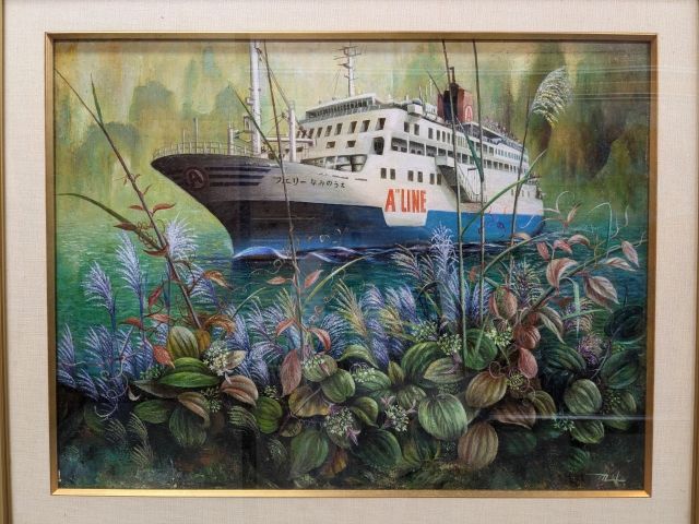 個人的に気になったのはこちらの《定期船》。マルエーフェリーが運行している「フェリー波之上」を描いた作品であり、植物の海を進むような構図が非現実的な感覚をもたらしてくれます。