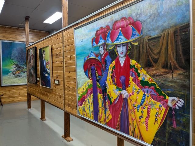 与論島出身の画家である池田政敏氏の絵画も多数展示されています。琉装やアダン、サンゴ礁など南西諸島らしい風景が、くっきりとした色彩で描かれており見応えあります。