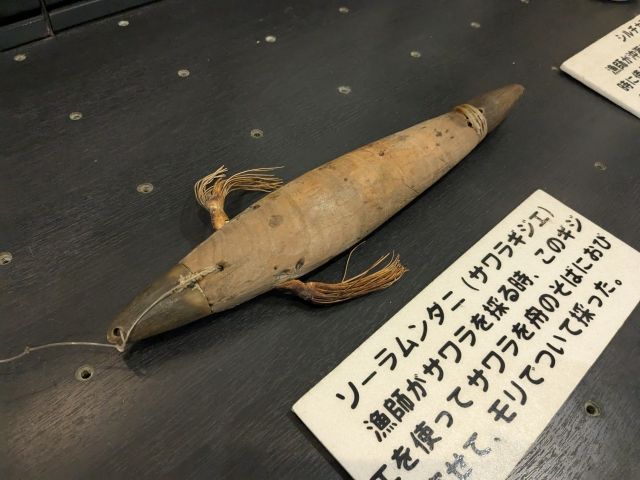 不思議なカタチの漁具は「ソーラムンダニ」。サワラ漁に使用される疑似餌であり、これを海に入れてサワラをおびき寄せてモリで突くそう。