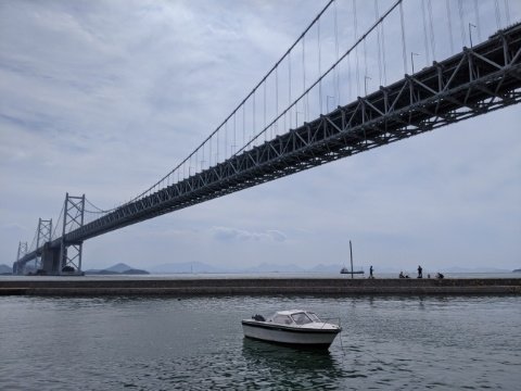 集落を歩いていると、すぐに海に出ます。視界に入るのは、大きく伸びる瀬戸大橋。こちらは与島から三つ子島まで繋がる北備讃瀬戸大橋です。