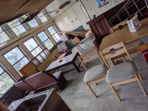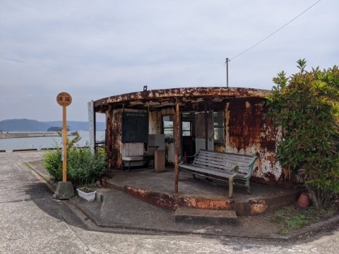 その中でも、港近くにある浦城(うらじょう)バス停は、まるで廃墟のような建物が建っており、インパクト抜群。全面サビついたそれは廃墟の趣きですが、こちらは廃船を利用した現役の待合室。