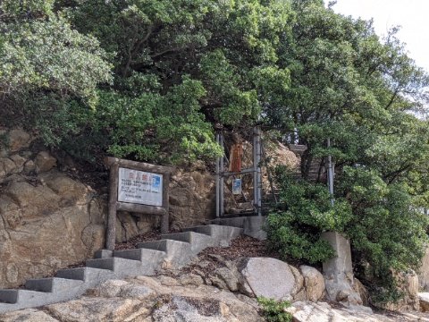 高速道路上に与島PAが設置されているため、そこに車を停めて歩いて降りることができます。こんなアクセス方法の島、日本でここだけではないでしょうか。