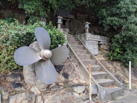 海沿いを歩いていると、道に唐突に現れるプロペラと祠。ポジション的に海上安全のご利益がありそうですが、詳しいことはわからず。プロペラはまるで扇風機のように設置されていますが、おそらく船のスクリューではないでしょうか。