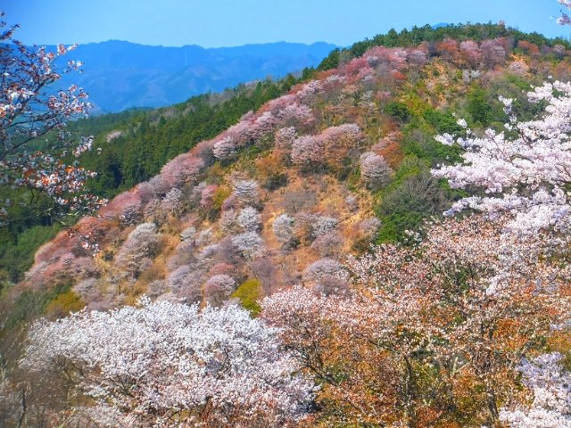 多くの人でにぎわう中千本エリア。いろいろなお店がたくさん並んでいるので、お土産探ししたり吉野山グルメを楽しんだりと、カジュアルに楽しむことができます。巨大な建築が迫力ある金峯山寺への参拝もお忘れなく!