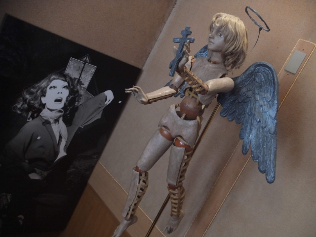 四谷シモンというのは人の名前。アングラな劇団において、男性でありながらも女優として活躍した俳優でした。館内の階段には、八端十字をかかげた天使とともに、女形時代の姿が映し出されています。