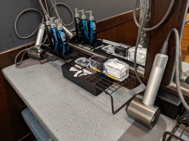 まず、2階の湯らっくすコース専用更衣室は化粧水やワックス、さらにはケープなどのアメニティが豊富。さらにドライヤーはダイソンです!お風呂屋さんでダイソン見つけると、ついつい使いたくなります。