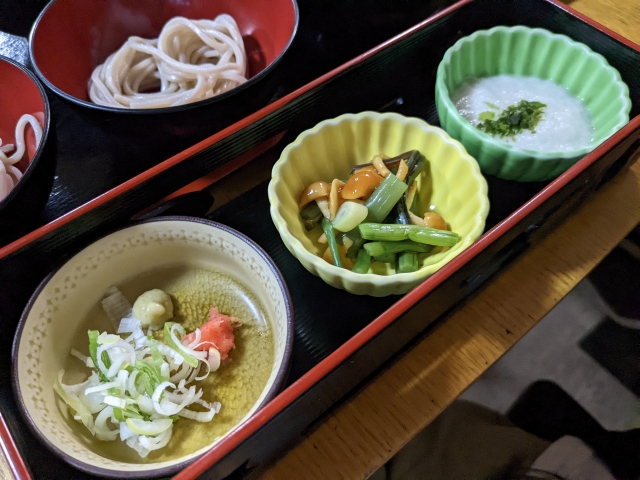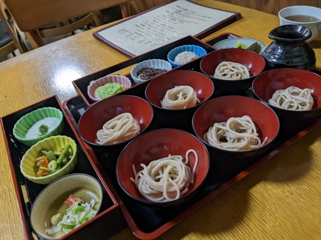 薬味はネギ・ワサビ・もみじおろし、山菜、とろろ。自分の好きな味をつくって楽しめます。お蕎麦がとっても美味しくて、ツユだけでも全部食べれそう。ソバは6杯と少なめですが、これくらいがちょうど良い人もいるのでは。