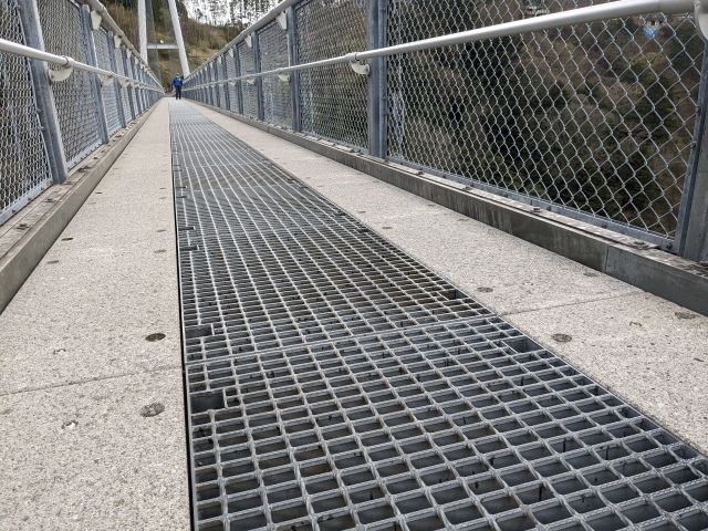 中央部の床版はグレーチングという「すのこ状」になっております。歩道部分は全面に渡りこの仕様なので、常にスリルを体感できるという高所恐怖症にはハードな仕様。両サイドはしっかりとした石造りなので、不安な方は橋のはしっこを歩きましょう。
