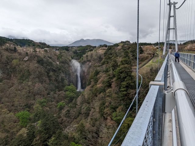 九酔渓に架かる巨大な歩行者専用吊り橋。足元に広がる深い谷や、勢いよく流れ落ちる多数の滝を見ることができます。床板は全面がすのこ状であるため、スリルを味わいたい方にもおすすめ。