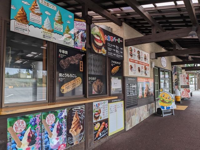 券売所の周りには、お土産屋さんや軽食販売のお店が軒を連ねています。土日祝日限定で、「九重“夢”バーガー」という名物メニューも。イノシシ肉を使った「シシガー」や、シカ肉の「鹿ガー」など、なかなか個性的なラインナップです。