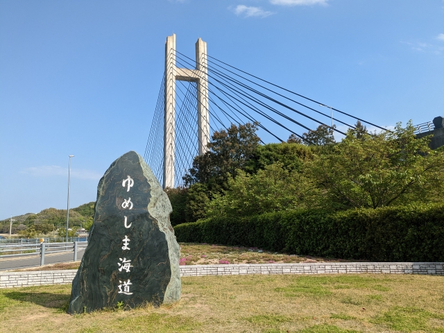さあ、最初はどこへ向かおう。なんとなく海辺を走っていると、見えてくるのが生名橋の袂に設けられた生名橋記念公園。「ゆめしま海道」の石碑も置かれており、最初に立ち寄るにぴったり。きれいなトイレもあります。