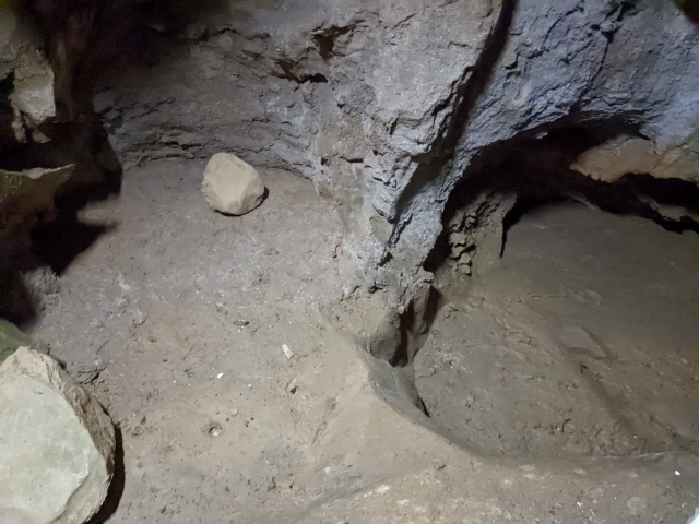なんてことはないスペース、こちらは「コウモリの墓場」。土の中にはコウモリの骨がたくさん埋まっているそう。この鍾乳洞は静かにしているとコウモリの羽音が響き渡ります。きっとたくさんのコウモリが棲息しているのでしょう。