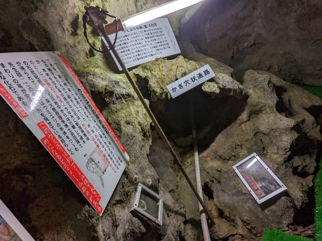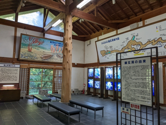 受付を済ませて進むと、まずは解説コーナーからスタート。鍾乳洞の案内図や、洞窟内で見つかった化石の展示などがあります。