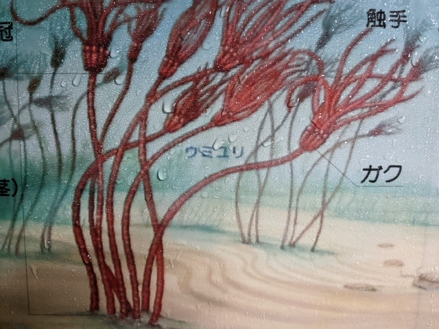 サッシのフレームとクリアなカバーがはめられているのは、ウミユリの萼(がく)の化石。岩盤上のものとしては日本初であったそう。