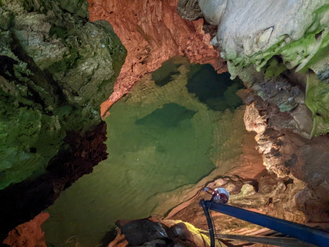 水を湛えた地底湖「浄魂の泉」。透明度の高い水は神秘的で、眺めていると吸い込まれてしまいそう。水深10mのポイントには、Jの字に曲がって伸びる不思議な鍾乳石があるそうです。