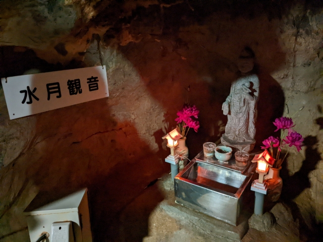 幽玄洞近くには観音霊山があり、古くから信仰の場として知られていました。その影響か、洞内には仏教や神道を感じるものも。いのち観音、水月観音などの仏像が要所要所に安置されています。