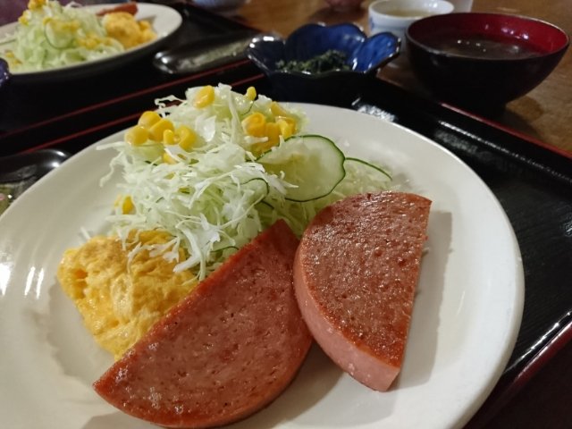 朝ごはんは、丸いポークとサラダ、スクランブルエッグという洋風なメニュー。