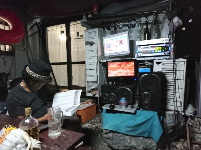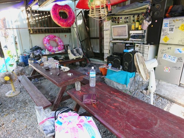 夕食後は、外のゆんたくスペースでのんびり。屋根つきとはいえ屋外にパソコンや扇風機・冷蔵庫などの家電が設置されているという、内地では考えられないレイアウト。