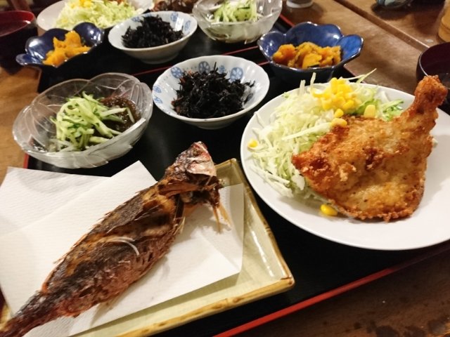 夕食は食堂にて、宿泊者が一緒に食べるスタイル。メニューは沖縄らしいグルクンの唐揚げと、なぜかフライドチキンでした。