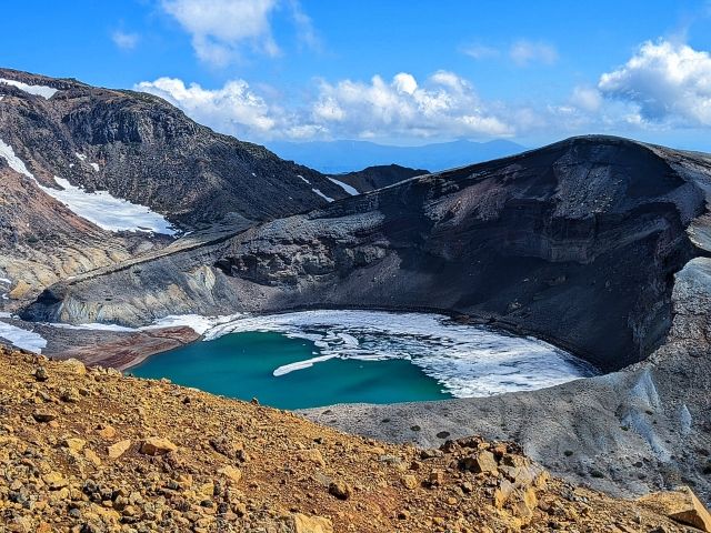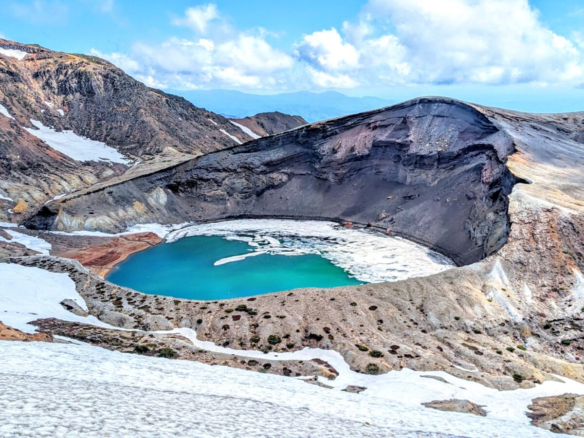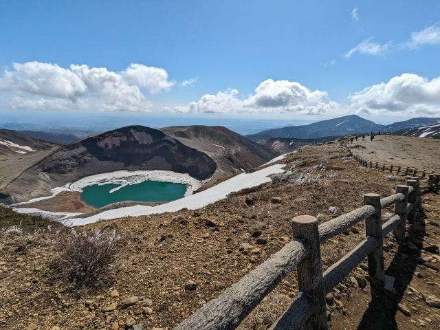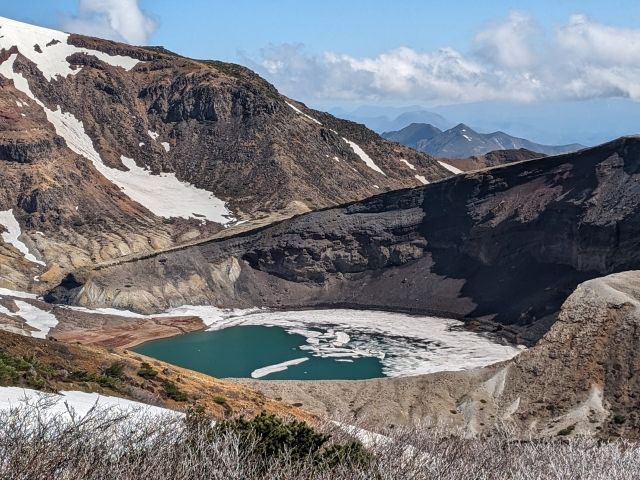 進めば進むほど姿が変わる御釜。特に御釜の周りが岩場から雪に変わっていくのがポイントです。5月はまだまだ水面にも氷が残っています。