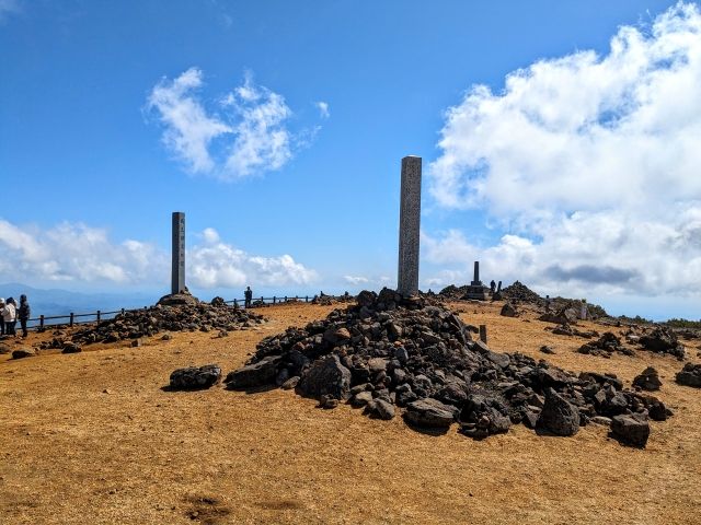 周辺には標柱を取り囲む積石が。荒涼とした地形に立つ姿は、なんとも異世界感があります。