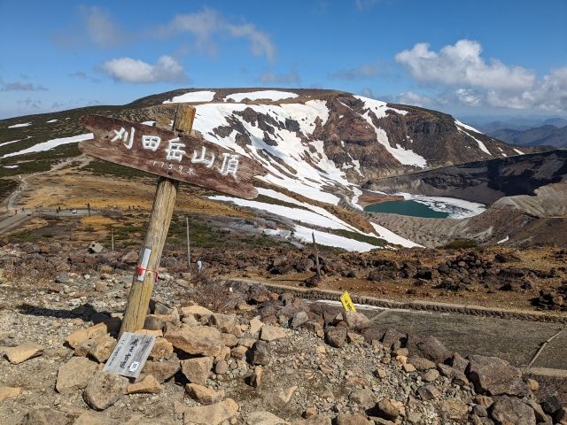 神社のすぐ傍にあるのは刈田岳山頂の標柱。蔵王連峰の主峰のひとつであり、その標高は1,759m。人気の撮影スポットです。