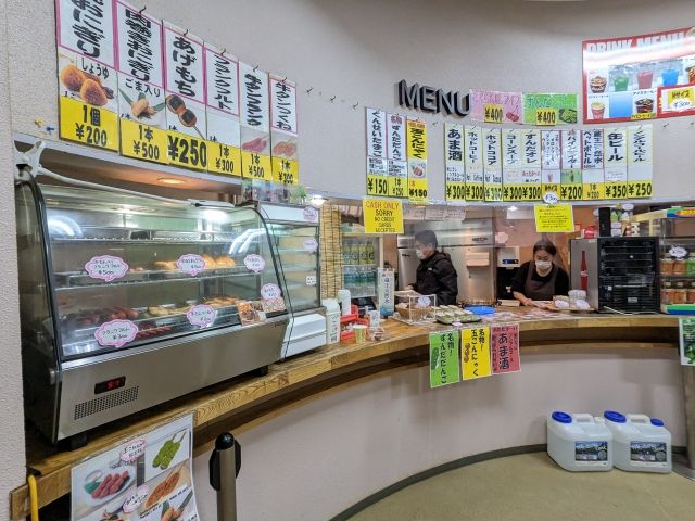 軽食のお店が営業開始していたので、牛タンフランクフルトとずんだオレの朝ごはんにしました。山頂はとっても寒いので、あったかいドリンクが身に沁みます。