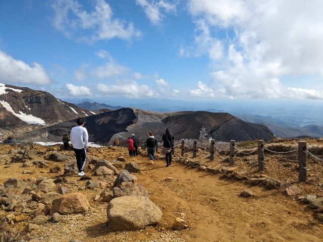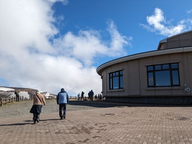 蔵王ハイラインの終点には蔵王山頂レストハウスがあり、そこから徒歩2分で御釜を見渡す展望台へとアクセスできます。標高は1,720m。近いねーッ、空!