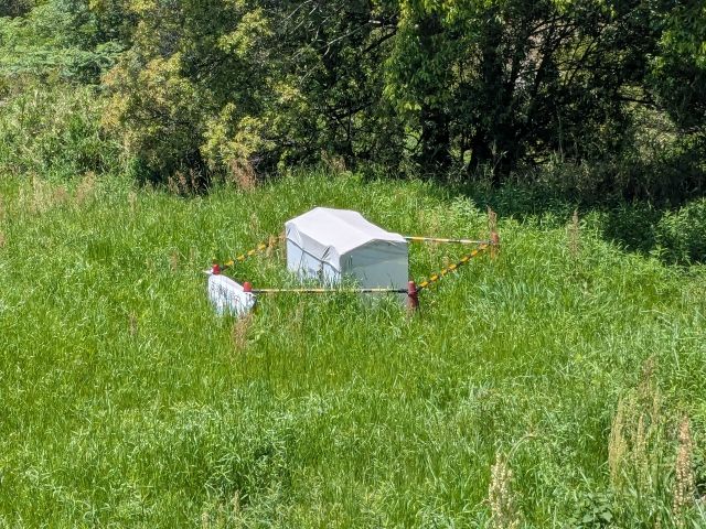 後円部の近くには、謎の白い箱が!こちらについて、詳しくは前回の作山古墳の記事にて。