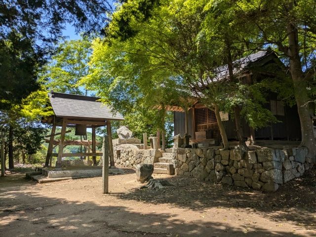 前方部に鎮座するのは荒神社。神社が築かれている「神社古墳」(※造語)です。神社であるにも関わらず梵鐘が吊るされているのは、神仏習合の名残でしょうか。