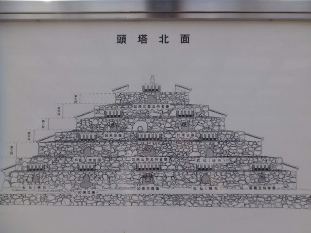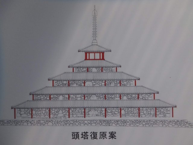 2000年に復原は完了していますが、案内板によると多宝塔のような復原案もあったそう。この姿ならばすんなり「塔」として受け入れられそうです。