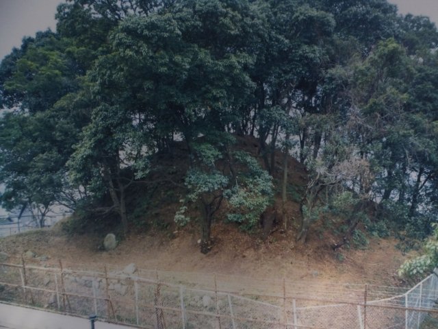 発掘調査前の姿が案内板に載っていました。木々が生い茂る姿は、小さな山にしか見えません。