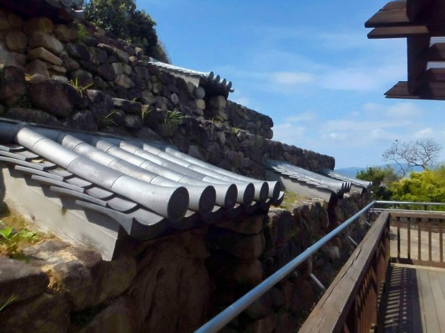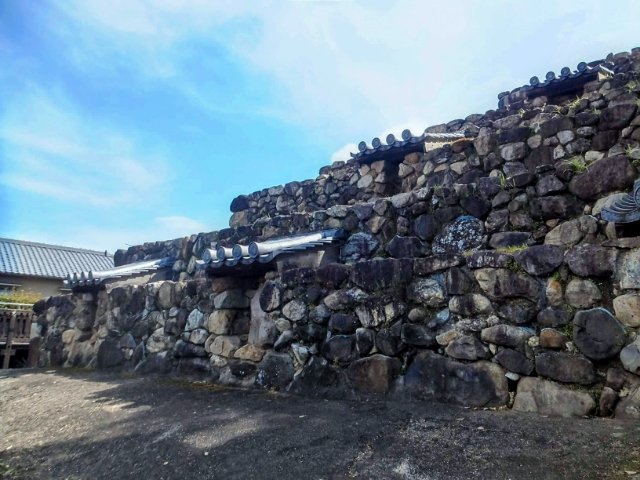 ピラミッド状の石垣に瓦屋根が乗った独特の外観。他の神社仏閣とは全く違うデザインはインパクト抜群!ゴツゴツと武骨な姿は、防衛機能が高そうに見えます。まるで砦や要塞のようです。